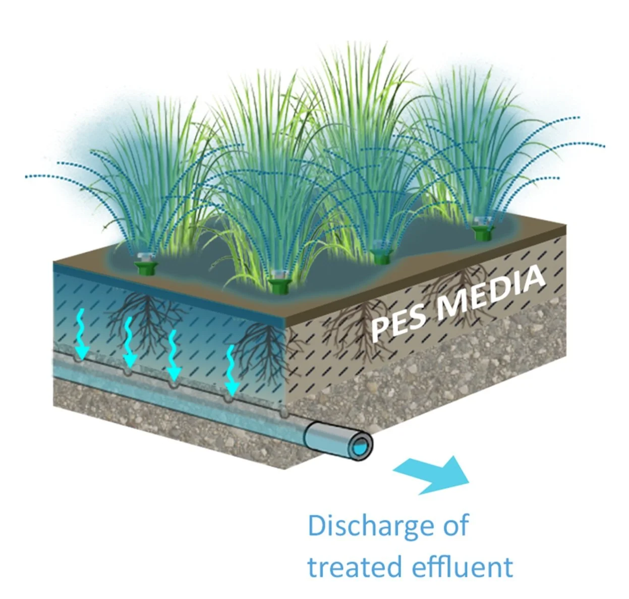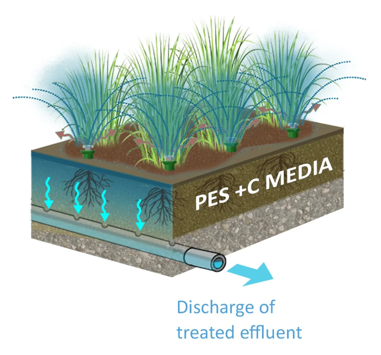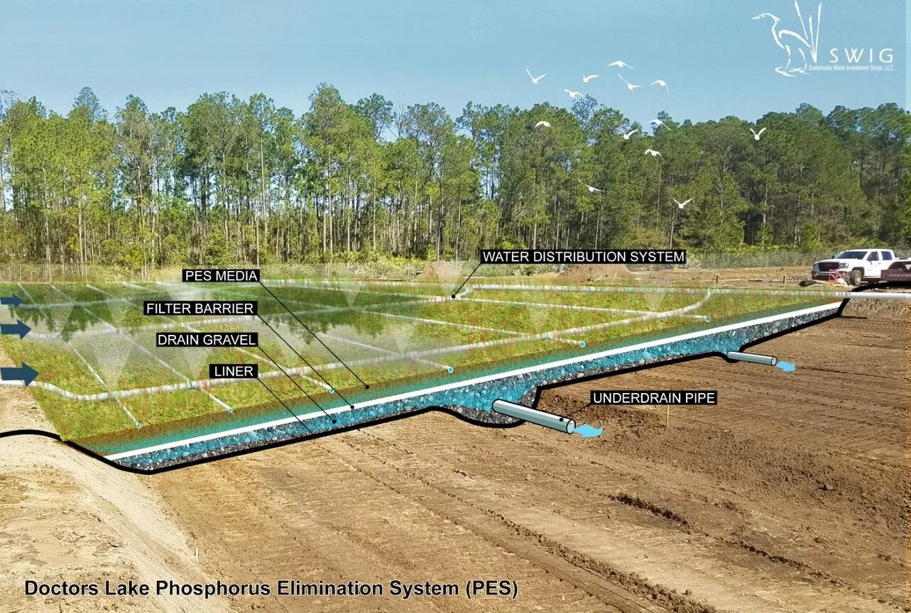 In the Phosphorus Elimination System (PES), nutrient-rich water is pumped and distributed over a vegetated bed. The water flows vertically through SWIG’s proprietary engineered media where phosphorus is adsorbed. Treated water is collected in an underdrain pipe and then discharged. Using our system, there are no toxic chemicals and no by-products. Other than the pumps used to transport the water to and from the system and the auto-samplers to document nutrient removal, the system is completely passive, making it highly resilient to natural events (e.g. cyclones). Phosphorus is permanently chemically bound to the PES media. Using a circular economy approach, PES media is derived from materials that are ordinarily landfilled. Media lifetime can be engineered to range from 5 to 20 years. Spent media is removed at the end of its useful life and used as an ideal soil amendment, as the bound phosphorus does not leach but is available to plant roots. In the ONE system, the media is optimized for nitrification, with denitrification (transformation to nitrogen gas) in an additional layer.